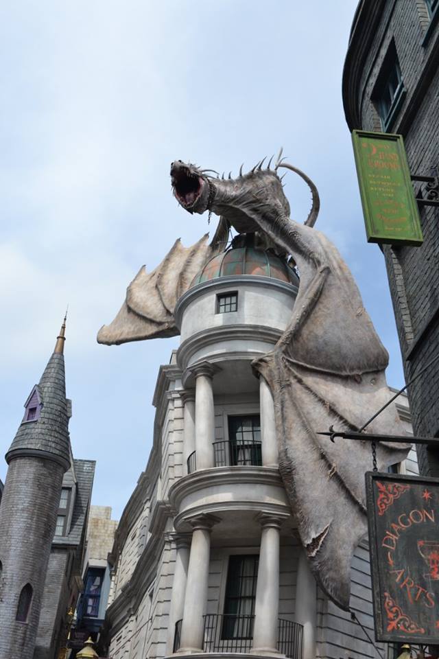 Over in this park, there are so many places to shop! You can purchase a robe from Madam Malkin’s Robes for all occasions, adopt a magical creature from Magical Menagerie, or visit Weasley’s Wizard Wheezes to pick up some magical jokes! Or you can visit Olivanders to have the wand choose you! And there is no shortage of authentic sights to see in this park – including a fire breathing dragon that just escaped from Gringott’s bank!