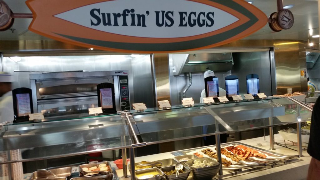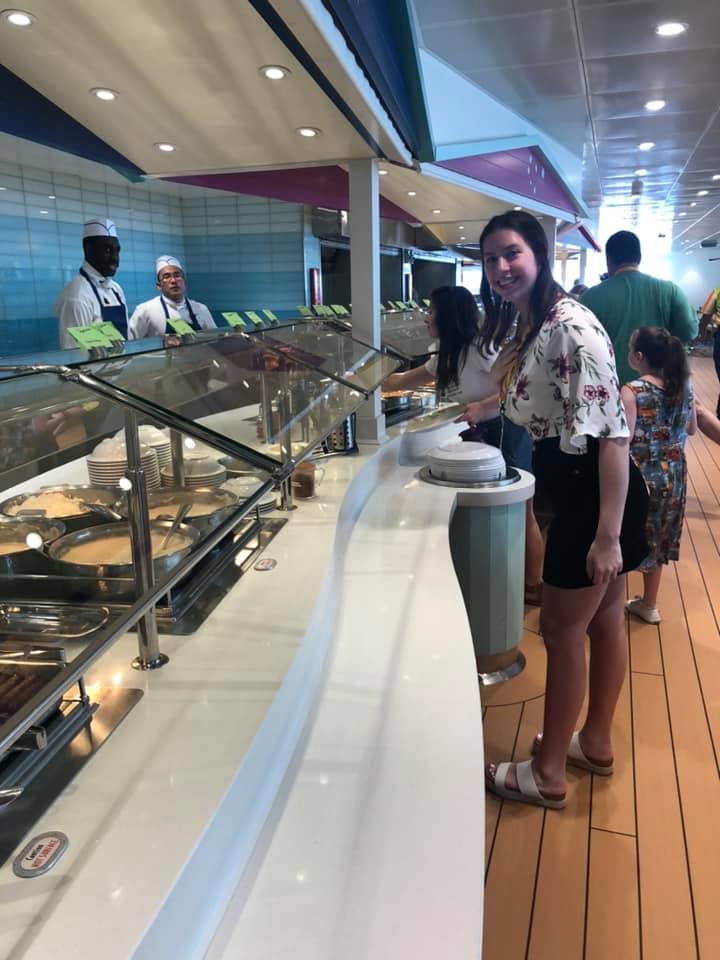The pool deck also offers fast food options! There is a pizza window and a window with plenty of typical American fare: burgers, chicken fingers, etc. You’ll also find limit-less fountain drinks and a dessert shop on deck. These are open most of the day and late into the night.