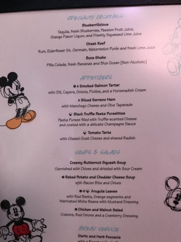 Palo is one of Disney’s specialty restaurants available on each ship. It is adult-exclusive. Palo is Northern Italian themed. This restaurant is available at an upcharge, currently $40 per person for brunch or dinner. This does need to be booked in advance as it is quite popular and can be difficult to get into. See more about Palo here.