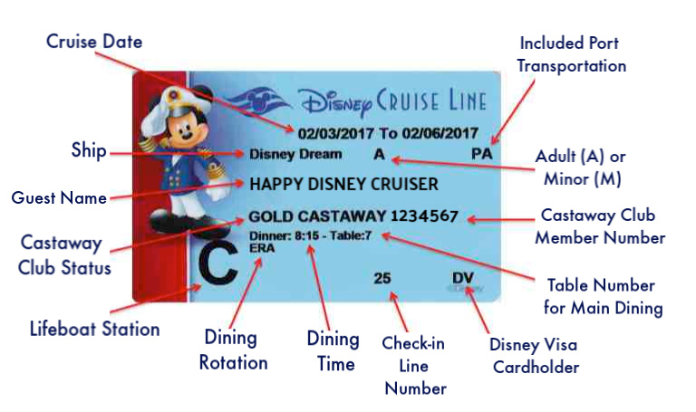 Not every guest’s card will have every item shown here. You’ll only have what’s applicable to you. For example, if it’s your first time cruising with Disney, you won’t have a Castaway Club Status. If you don’t have a Disney Visa or haven’t arranged Port Transportation (from and to the airport or a Disney Resort hotel), those items will be missing, too.