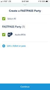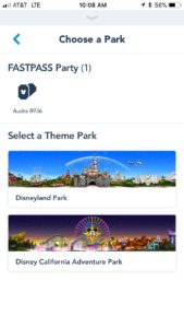 This time, you will choose “Get FASTPASS with Disney MaxPass,” as indicated in the red circle above. Choose which members of your party need FASTPASS, then choose the park you are touring. When you’ve chosen the park, a list of attractions with FASTPASS available will load on the screen. Pick your FASTPASS, confirm, and you are ready to go!