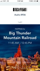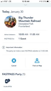 If you would like to know when you can reserve your next FASTPASS, read the fine print at the bottom of your selection. On my Big Thunder Mountain Railroad FASTPASS, it indicates that my next selection can be made at 10:55am. That timing happened to line up with the time I could begin using the FASTPASS, but it doesn’t always.