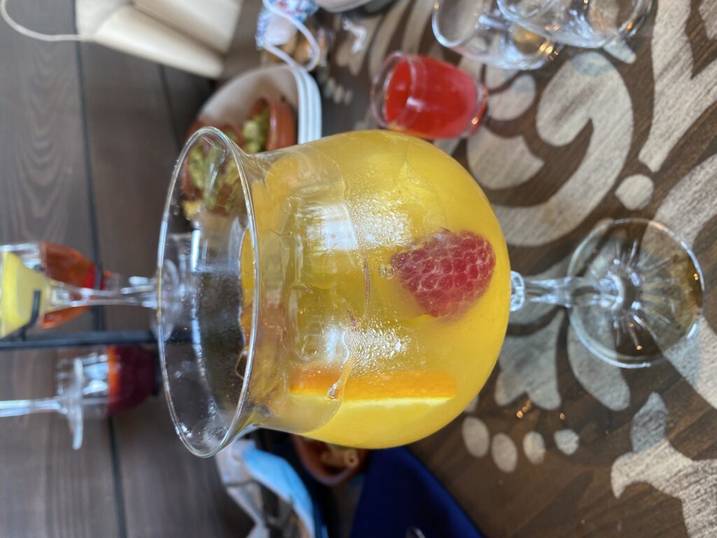 Sangria made with a sparkling wine and peach schnapps, with raspberries, orange slices, pineapple, and orange juice add-ins.