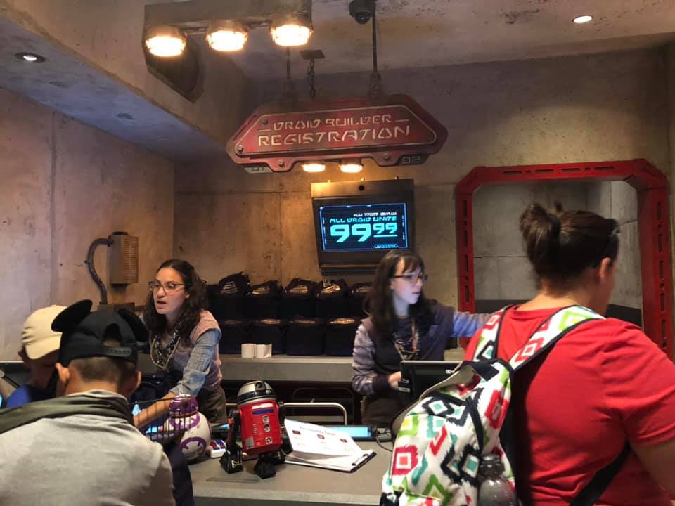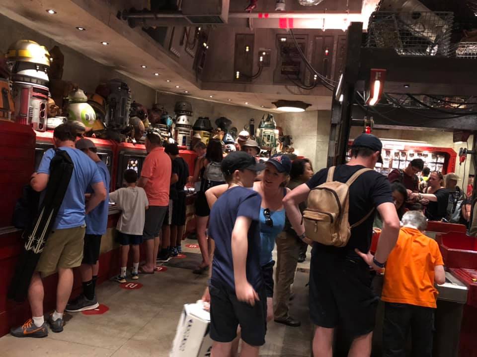 Droid Depot is much more hands on and incredibly kid-friendly. When checking in here, there are two cast members with tablets at the end of the line leading to the register where you will gather your basket to get your parts to build your droid. You get to pick between BB and R series droids. You’ll be given a basket that shows what parts you need to obtain from a conveyor belt that is continuously running. Grab the parts off the belt then head to an open work station.