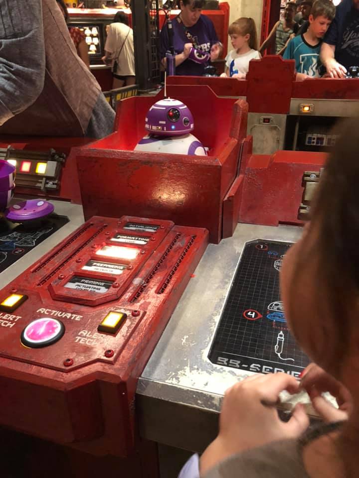 Once at your work station, a cast member will give some quick, helpful tips, then you are on your own to start building your droid. When you finish, you push a button indicating you area ready to activate your droid. A cast member will come over and help. Then you are ready to go give your droid for a spin outside. There is a mat they have set up across from the depot for this exact purpose! These droids are meant to interact with others around them, so there is quite a lot of noise and chatter over here.