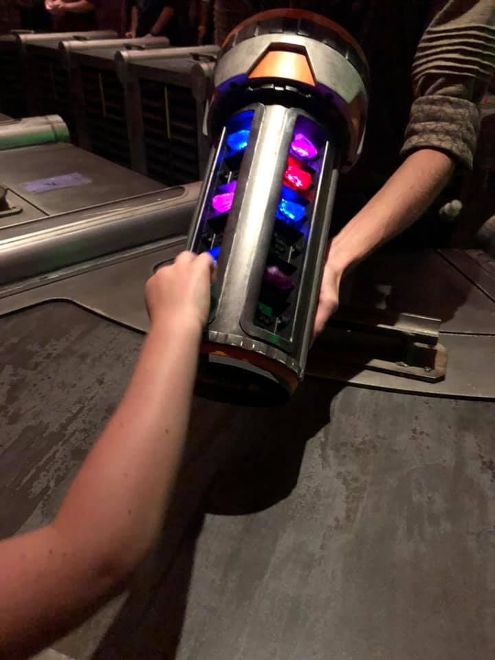 Once it is time to start assembling, one cast member will help 3-4 guests at once as your put your lightsabers together. Then before picking your crystal that determines what color light your lightsaber will emit, there is some explanation about what those colors mean and represent. Once everyone selects their crystals and you put those in your lightsaber, cast members come around and assist with inserting your handles into the spot on the workshop station where you attach your sheath. Once that has been completed for everyone, all new owners get to turn their lightsabers on and hold them in the air. As you leave the workshop you get a case that will protect the lightsaber as you venture outside the planet Batuu.