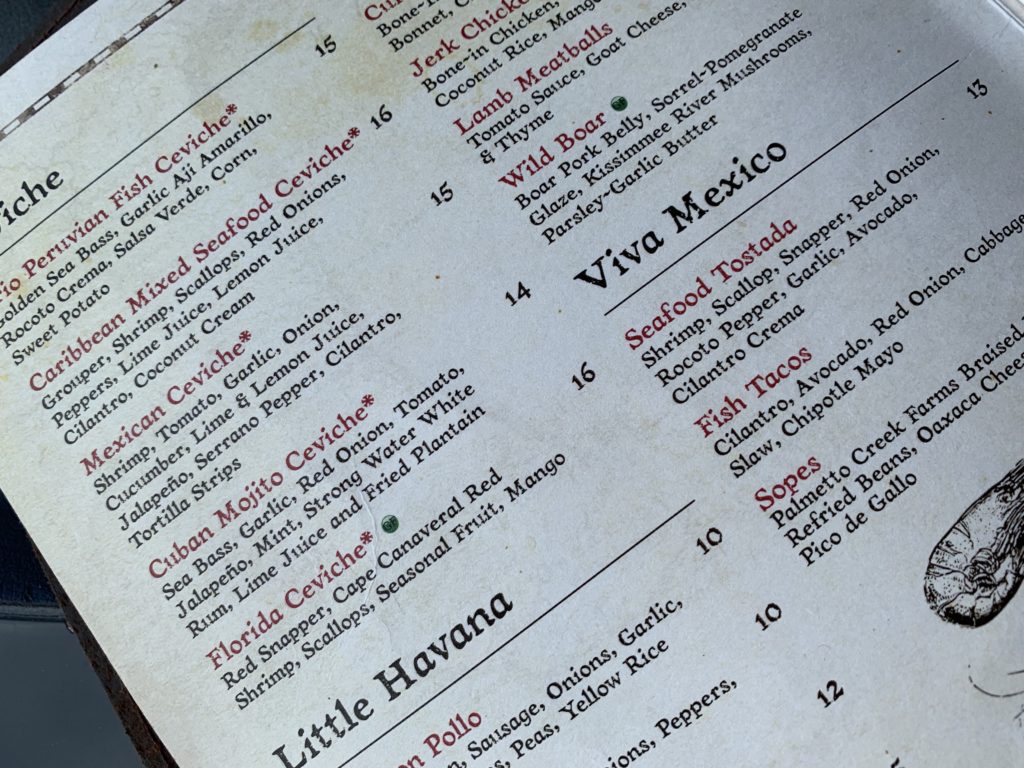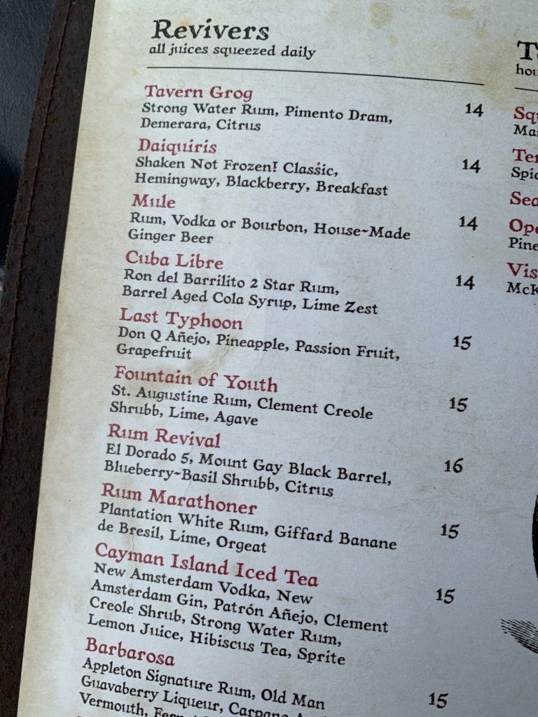 While they have anything you could want including wine and beer, Rum is their specialty as we went with rum drinks. Fountain of Youth the first visit for me and to accompany our Florida Ceviche on our second late-night visit, a Cayman Island Iced Tea.