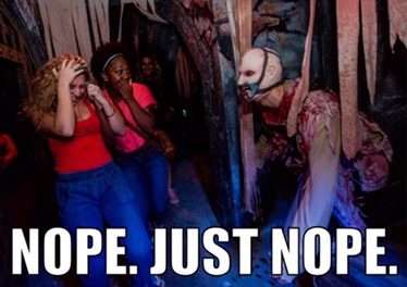 On my trip, I toured these two scare zones in the daylight hours.  With the lights on.  Without any background music.  Without any Scharacters.  Without any moving animatronics.  With two Universal guides giving us all the background information we could ever NOT want and a slew of travel professionals.  And I STILL felt the need for a Depends!!!  The actual words, “Jesus doesn’t like this” came out of one agent’s mouth.  Ha!  After the fact, it was a hilarious experience that I continue to talk about with my co-workers.  But in the moment, the only thing that came to mind was “People be crazy!” #thethingsidoforthisjob  #toeachhisown