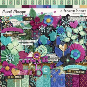 A digital scrapbooking kit by Studio Flergs. A frozen heart was inspired by a Norwegian Princess named Anna. Striking bold colors, rosemaling patterns, and filled with beautiful elements. A Frozen Heart is perfect for fans of the other sister! But also great for winter pages, sisters or more. **Look for her sister’s kit as well.**