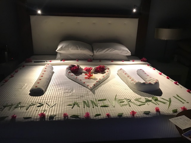 My husband and I recently took a trip to an all inclusive resort to celebrate our 15th Anniversary. After dinner, we found a surprise in our room—champagne, a special dessert, and a message spelled out in flowers and palm leaves on our bed!