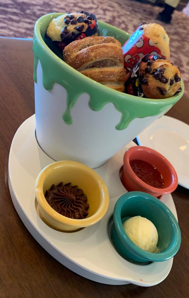 The characters will make their way around during your meal and visit your table several times. Even though they are still socially distanced, the interaction is wonderful here and the outfits? The CUTEST I’ve ever seen! Painter Mickey, Poet Minnie, Sculptor Donald & Dancer Daisy are dressed to impress!