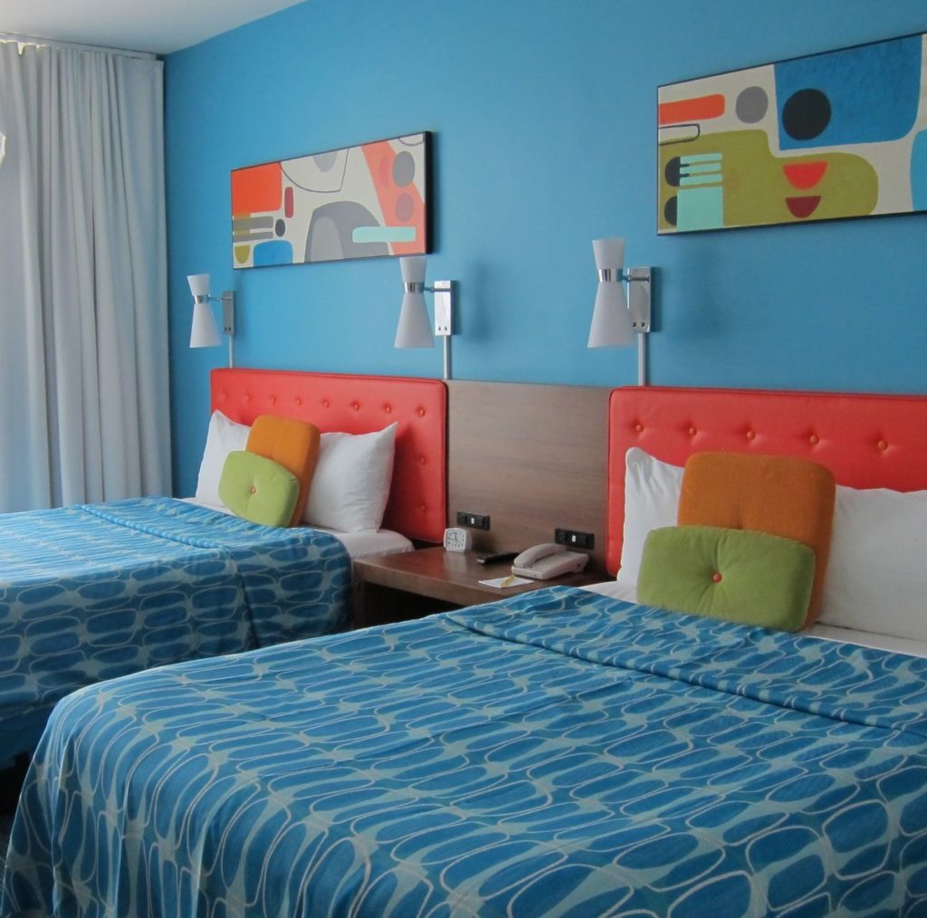 Picture yourself here – enjoying a leisurely float on the lazy river at Cabana Bay Beach Resort at Universal Orlando. Or maybe zipping down a waterslide is more your style – you can do that too, since there are two pools at this resort which is themed to take you (or your parents or grandparents) down memory lane.