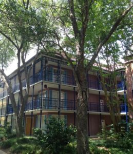 Again, the main building is where you’ll find the lobby/guest check-in, food court, and gift shop. In addition to the resort Quick Service food court, on-site dining options include a poolside bar, in-room pizza delivery in the evenings, as well as at least one Table Service restaurant (excluding Port Orleans French Quarter) and at least one indoor bar or lounge.