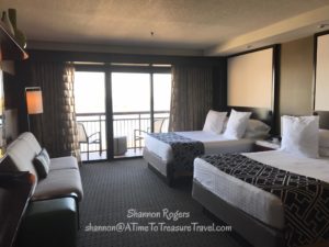 Deluxe Studio rooms, 1 Bedroom Villa, 2 Bedroom Villa, or 3 Bedroom Grand Villa are the room options and can range in size from about 316 square feet to almost 2500 square feet, accommodating from up to 4 to up to 12 guests (plus an infant).  Bedding varies based on the room type, but most have a combination of traditional beds and sleeper sofas and/or chairs.