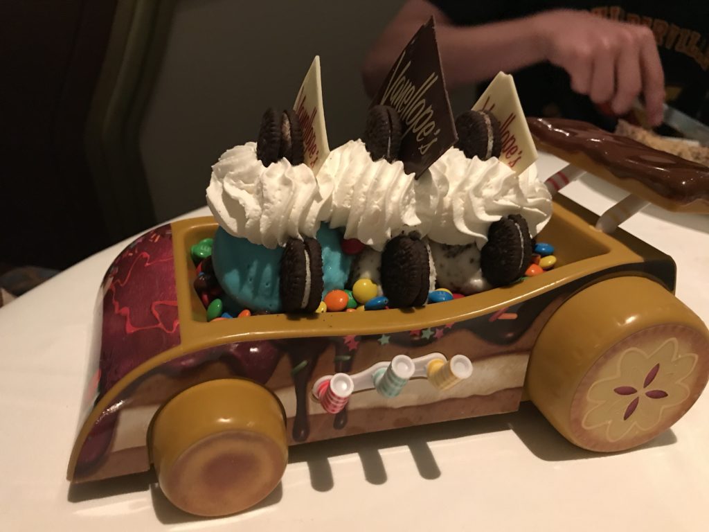 We tested this out on our recent cruise for my ice cream loving son’s birthday. That afternoon, I went to Vanellope’s and ordered a race car sundae, choosing the gelato and toppings. They fill out a form and then give you a small card with instructions to hand this card to your server when you sit down for dinner. Your server will then take care of calling up and having them make the treat and deliver it to them and they will bring it out. Worked like a charm!